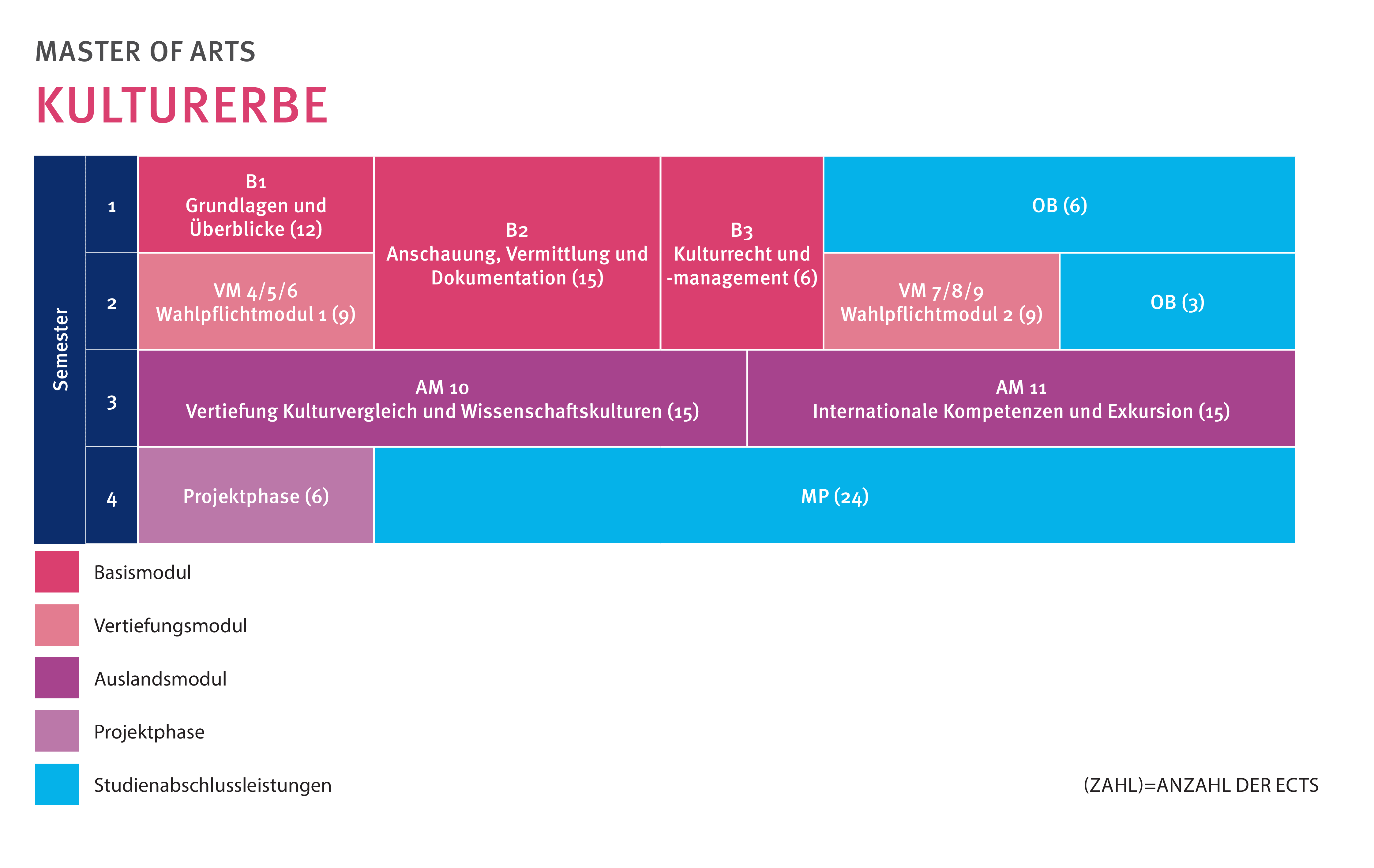 In der Aufbauphase studierst du zunächst Veranstaltungen aus den Basismodulen 1, 2 und 3. In diesen Basismodulen steht die Auseinandersetzung mit grundlegenden Begriffen und theoretischen Konzepten des kulturellen Erbes im Vordergrund. Anschließend besuchst du Veranstaltungen der Vertiefungsmodule: