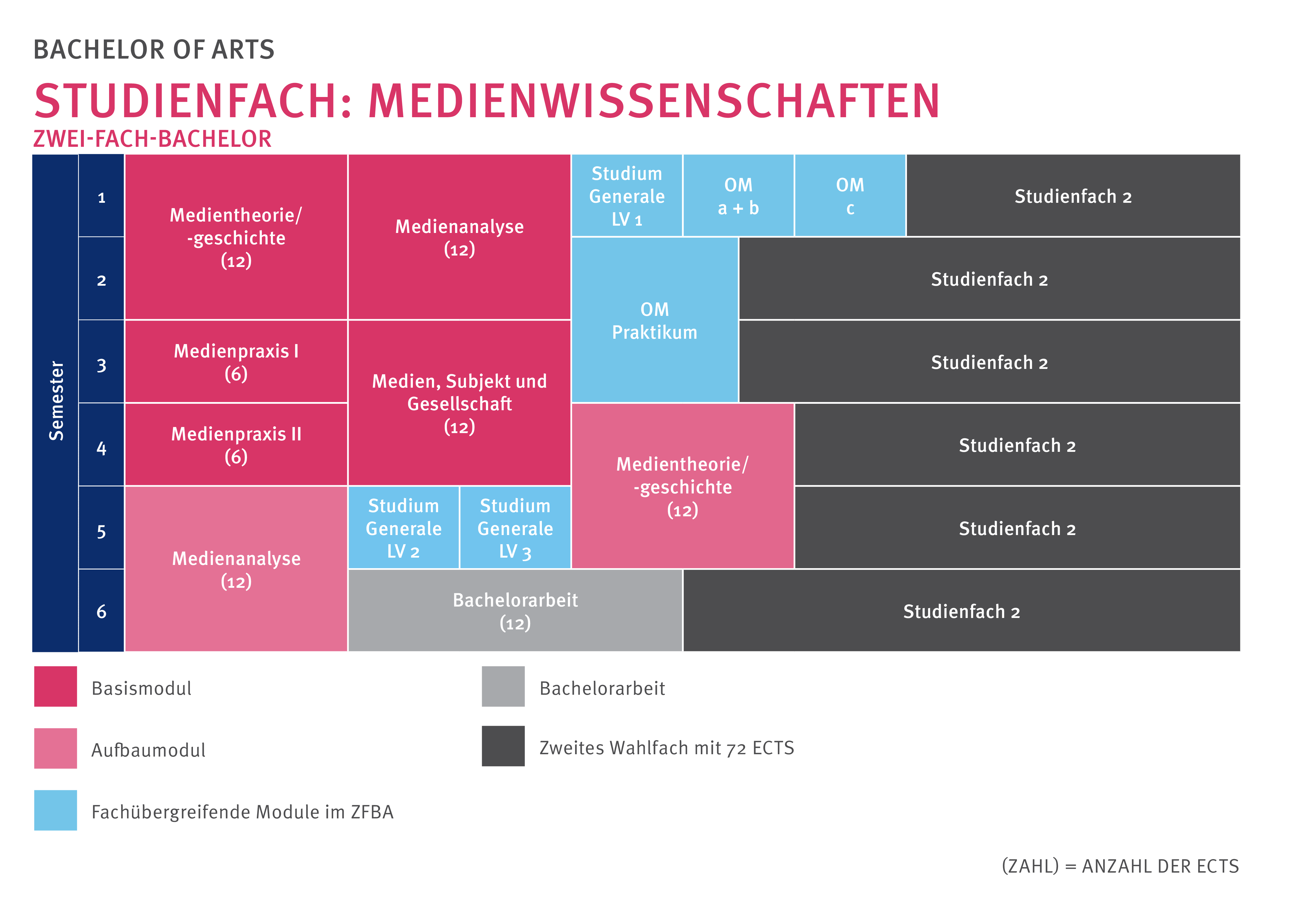 Im Rahmen des Zwei-Fach-Bachelors werden zwei Fächer gleichwertig studiert. Du musst also das Fach Medienwissenschaften mit einem weiteren Fach kombinieren. Auf der Webseite des Zwei-Fach-Bachelors Kulturwissenschaften findest du allgemeine Informationen zum Studiengang, zur Fächerübersicht und zu den Kombinationsmöglichkeiten.