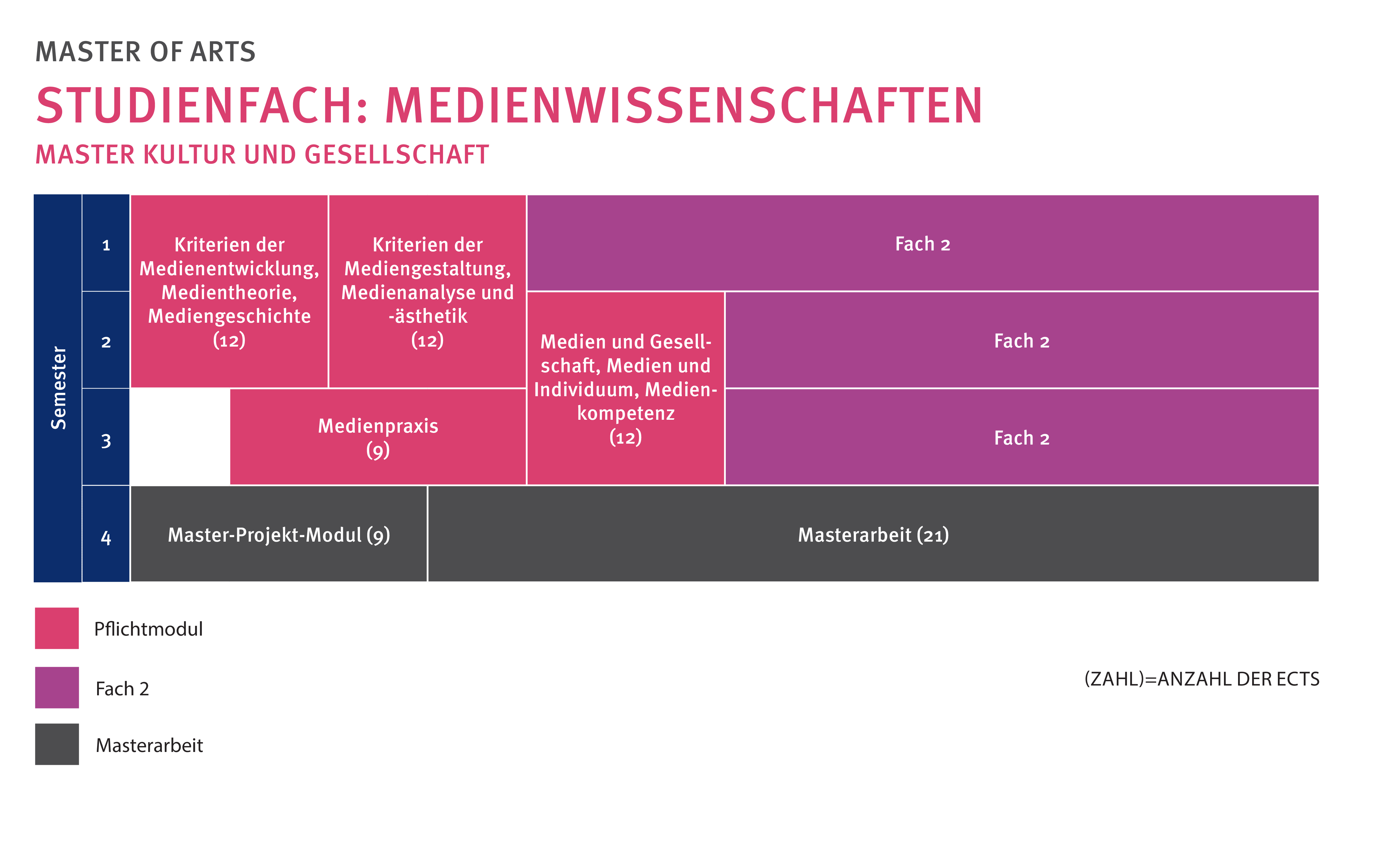 Das Studienfach Medienwissenschaften im Rahmen des Master Kultur und Gesellschaft ist modularisiert. Aufbauend auf einer Einführungsveranstaltung vertiefst du in den unterschiedlichen Modulen die theoretischen, historischen und ästhetischen Modelle des Fachs. In einem medienpraktischen Modul entwickelst und realisierst du eigene Praxisprojekte.