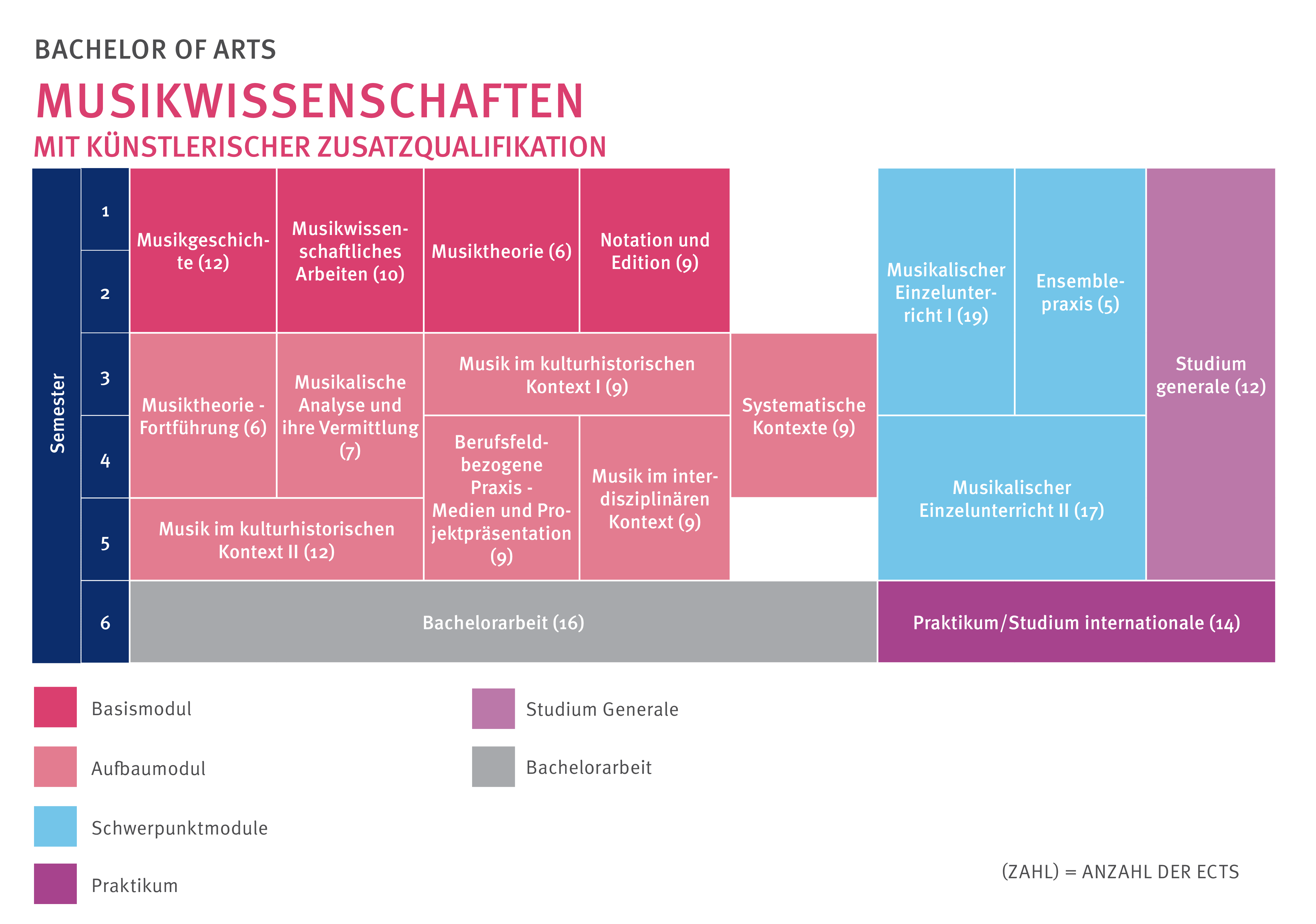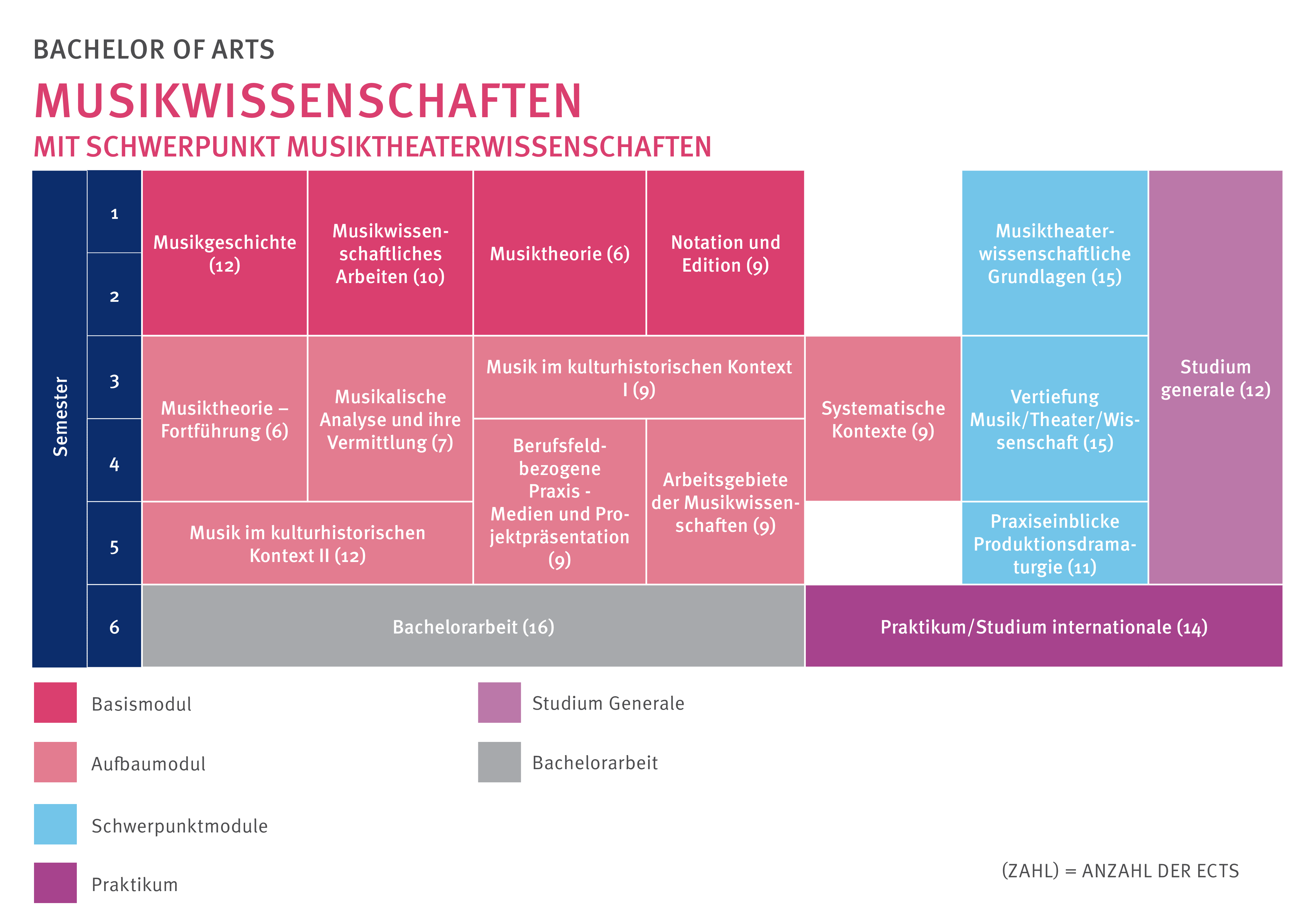 Den Hauptanteil des Studiums bilden die musikwissenschaftlichen und musiktheoretischen Lehrveranstaltungen zur Geschichte der Musik von der Antike bis zur Gegenwart, zum musikwissenschaftlichen Arbeiten, zu Satzlehre und Analyse sowie zu den vielfältigen kulturwissenschaftlichen und systematischen Arbeitsgebieten der Musikwissenschaft. Dein individueller Wahlschwerpunkt - entweder Musiktheaterwissenschaft oder eine künstlerisch-musikalische Ausbildung - macht etwa ein Viertel des Studiums aus.