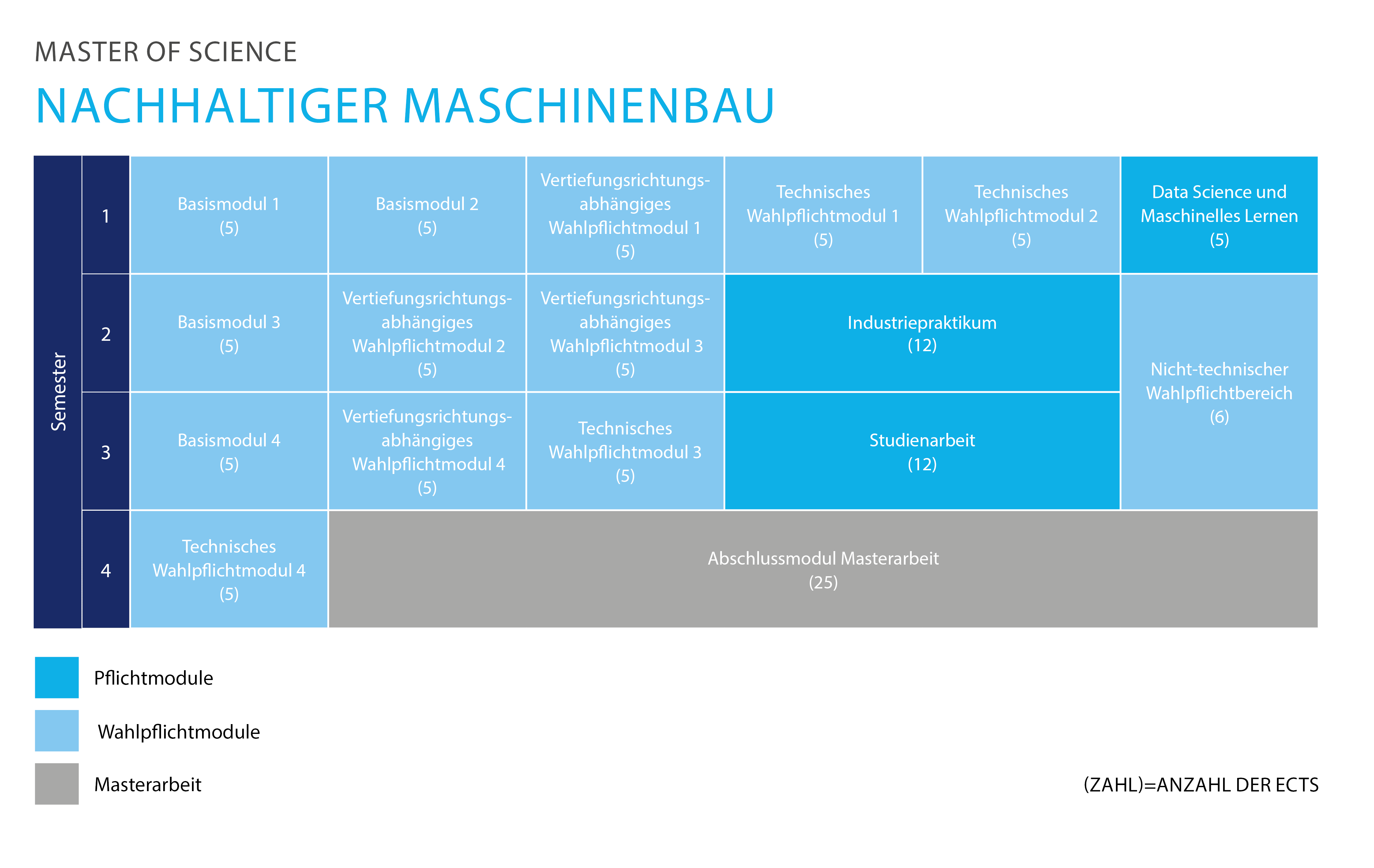 Das Masterstudium Nachhaltiger Maschinenbau beginnt mit der Wahl der Vertiefungsrichtung. Dadurch legst du dich bereits für vier Basismodule fest. Hinzu kommen anschließend weitere vier von der Vertiefungsrichtung abhängige Wahlpflichtmodule.