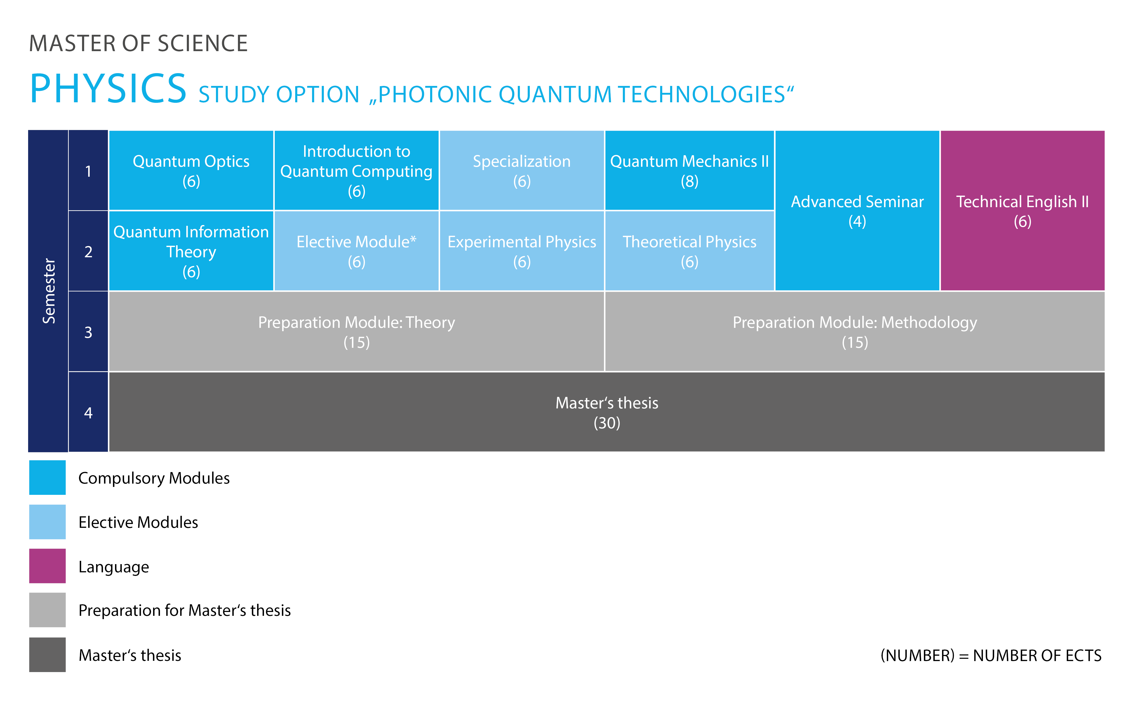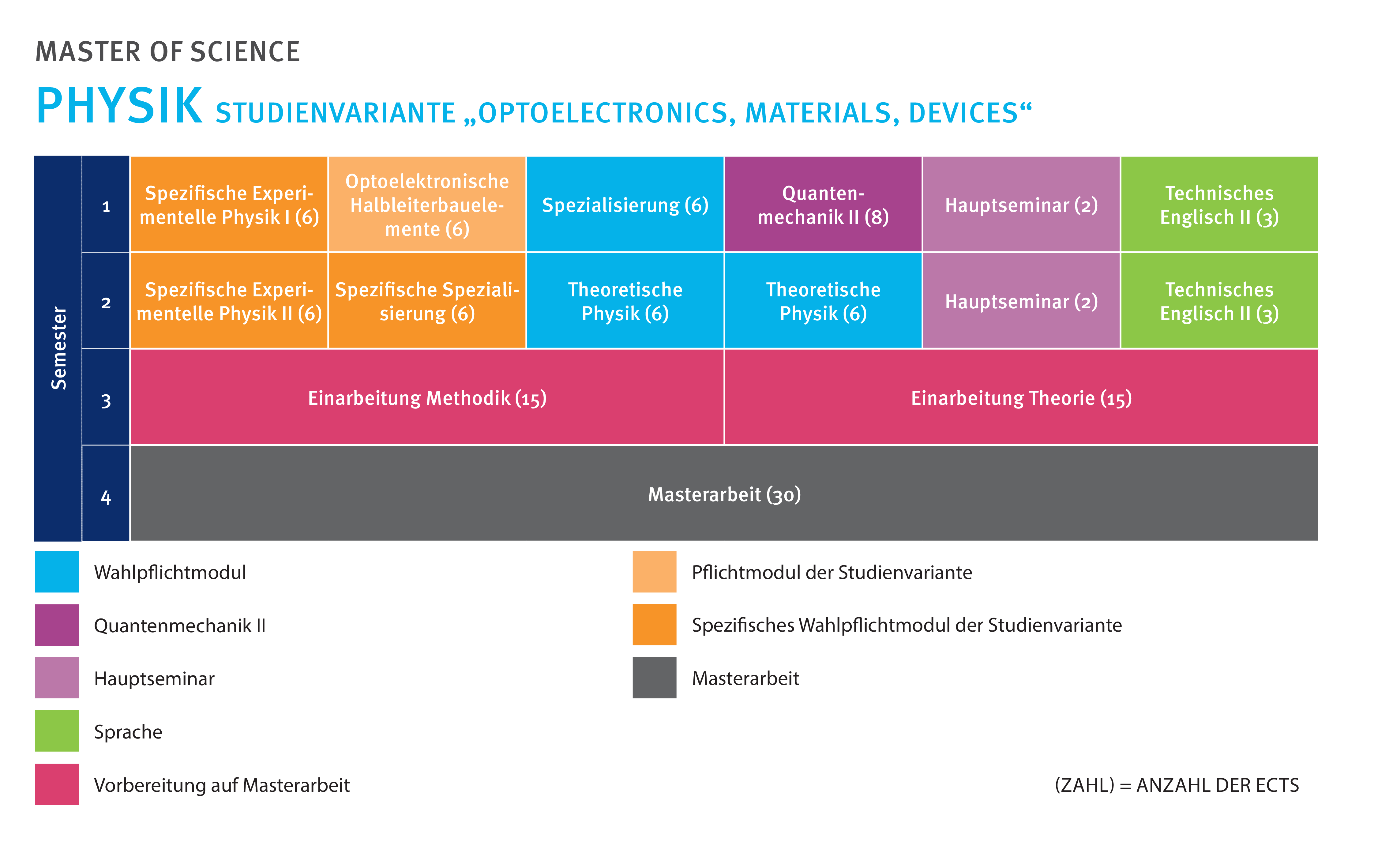 Bei den beiden Varianten Optoelectronics, Materials, Devices und Photonic Quantum Technologies müssen im Wahlbereich spezielle Kurse gewählt werden. Näheres Dazu erfährst du in der Prüfungsordnung.