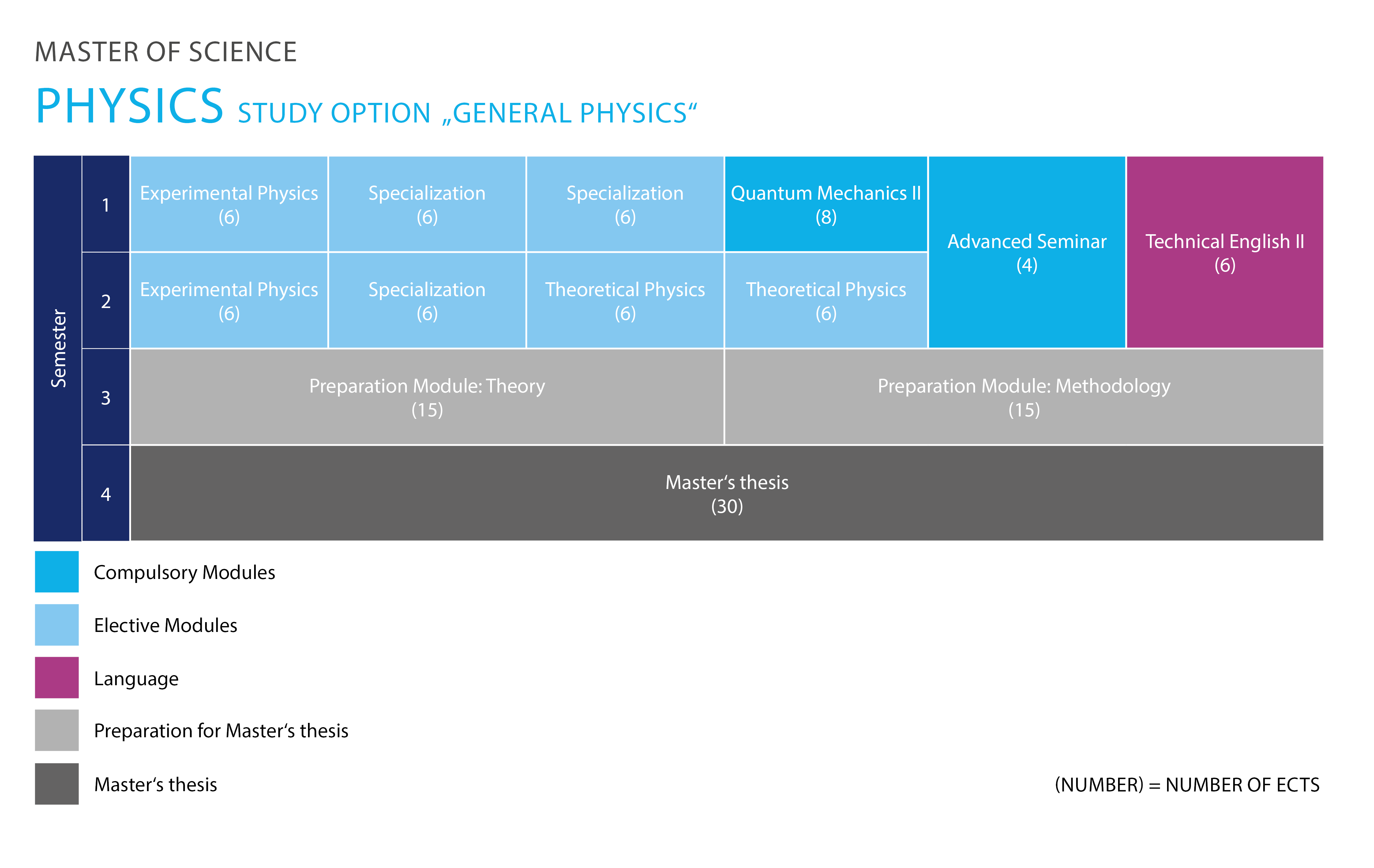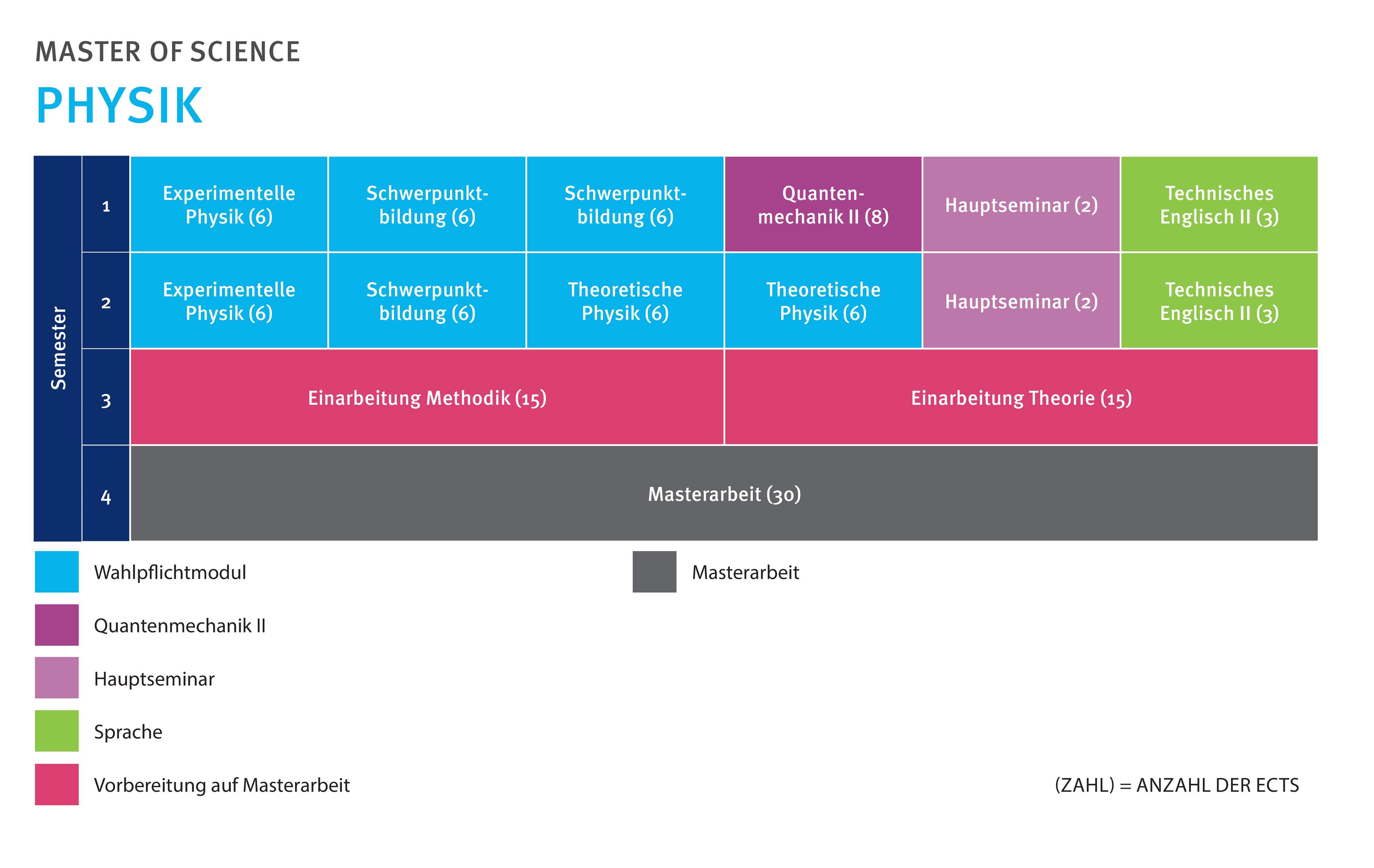 Das Studium besteht aus einem ersten Abschnitt, in dem du an Lehrveranstaltungen teilnimmst (fachliche Vertiefungsphase), und einem zweiten Abschnitt, der dich im Rahmen einer umfangreichen Masterarbeit in eine selbstständig forschende Tätigkeit im Bereich der Physik einführt (Forschungsphase). Im Rahmen der Masterarbeit stellen wir fest, ob du die inhaltlichen Grundlagen der Physik, einen systematischen Überblick sowie ein methodisches Instrumentarium für eine selbstständig forschende Tätigkeit im Bereich der Physik und ihren technologischen Anwendungen erworben hast.