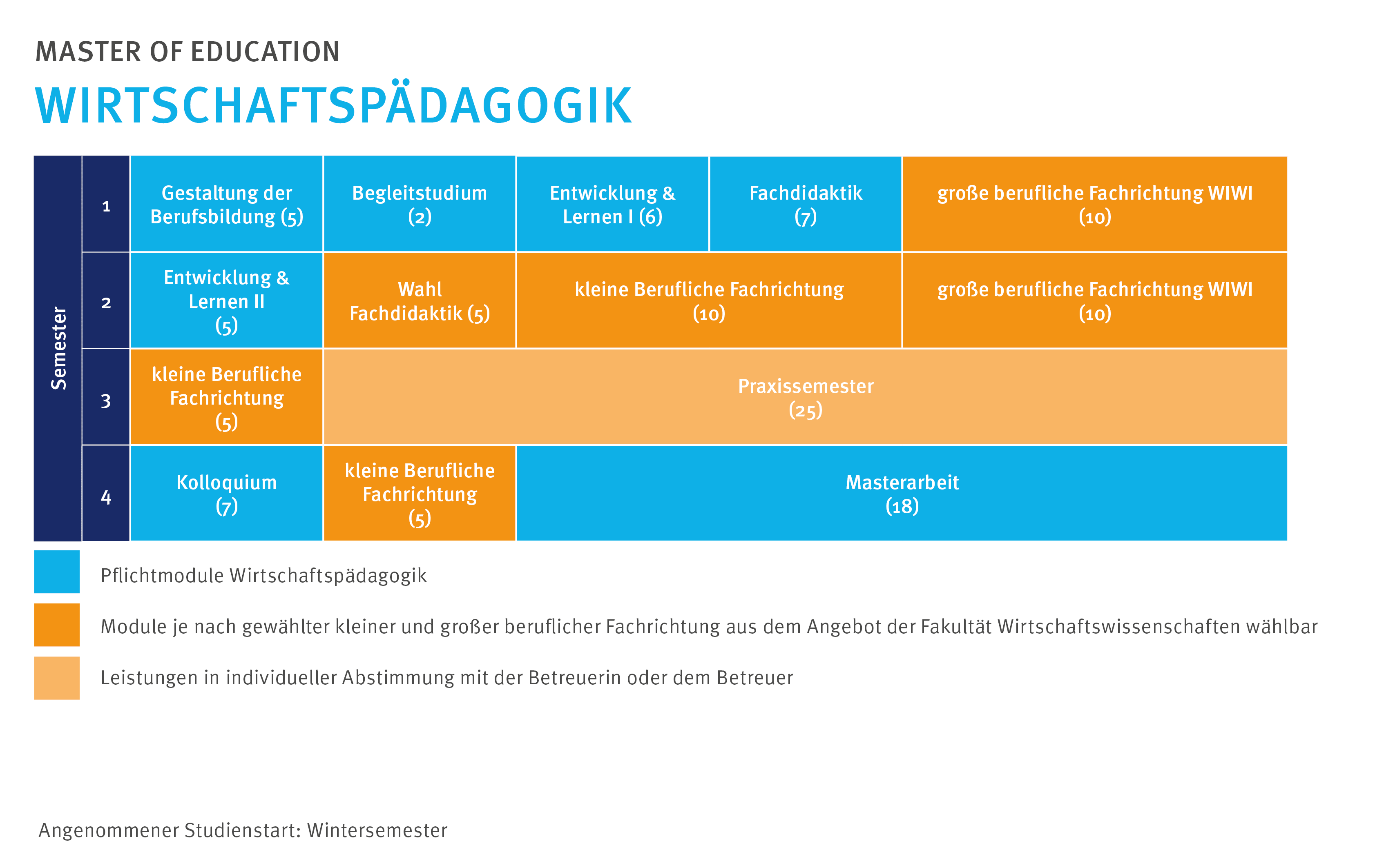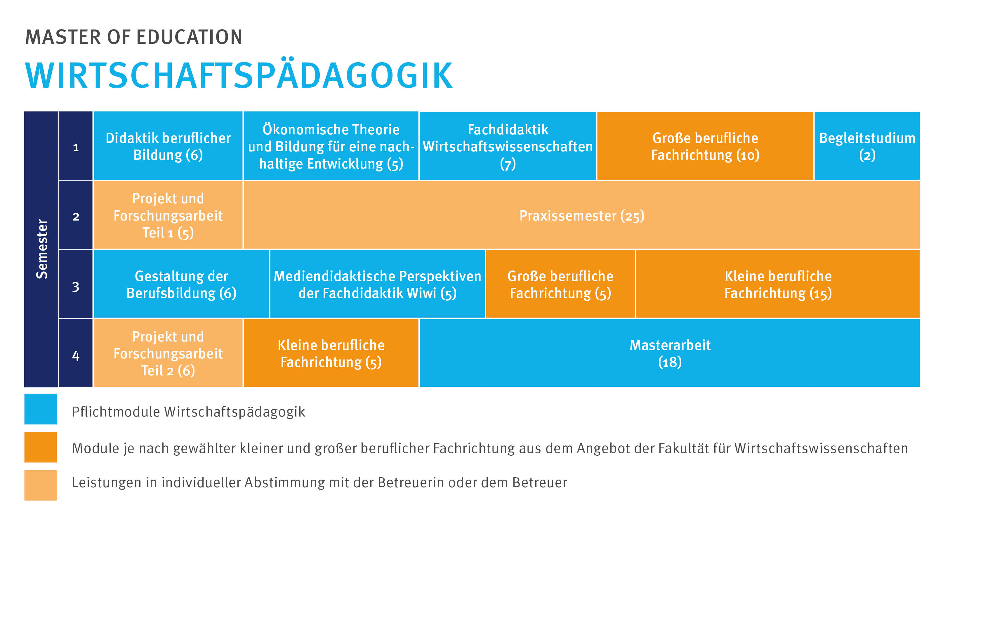 Der Studiengang M.Ed. Wirtschaftspädagogik vermittelt eine Kombination aus wirtschaftswissenschaftlichem Fachwissen, Grundlagen der beruflichen Bildung sowie fachdidaktischen Methoden. Während du in der fachwissenschaftlichen Ausbildung individuelle Schwerpunkte setzen kannst, werden die Bereiche der Bildungswissenschaft und der Fachdidaktik durch Pflichtmodule abgedeckt. Das Praxissemester bietet anschließend die Chance, bereits während des Studiums Lehrerfahrung an einem Berufskolleg zu sammeln.