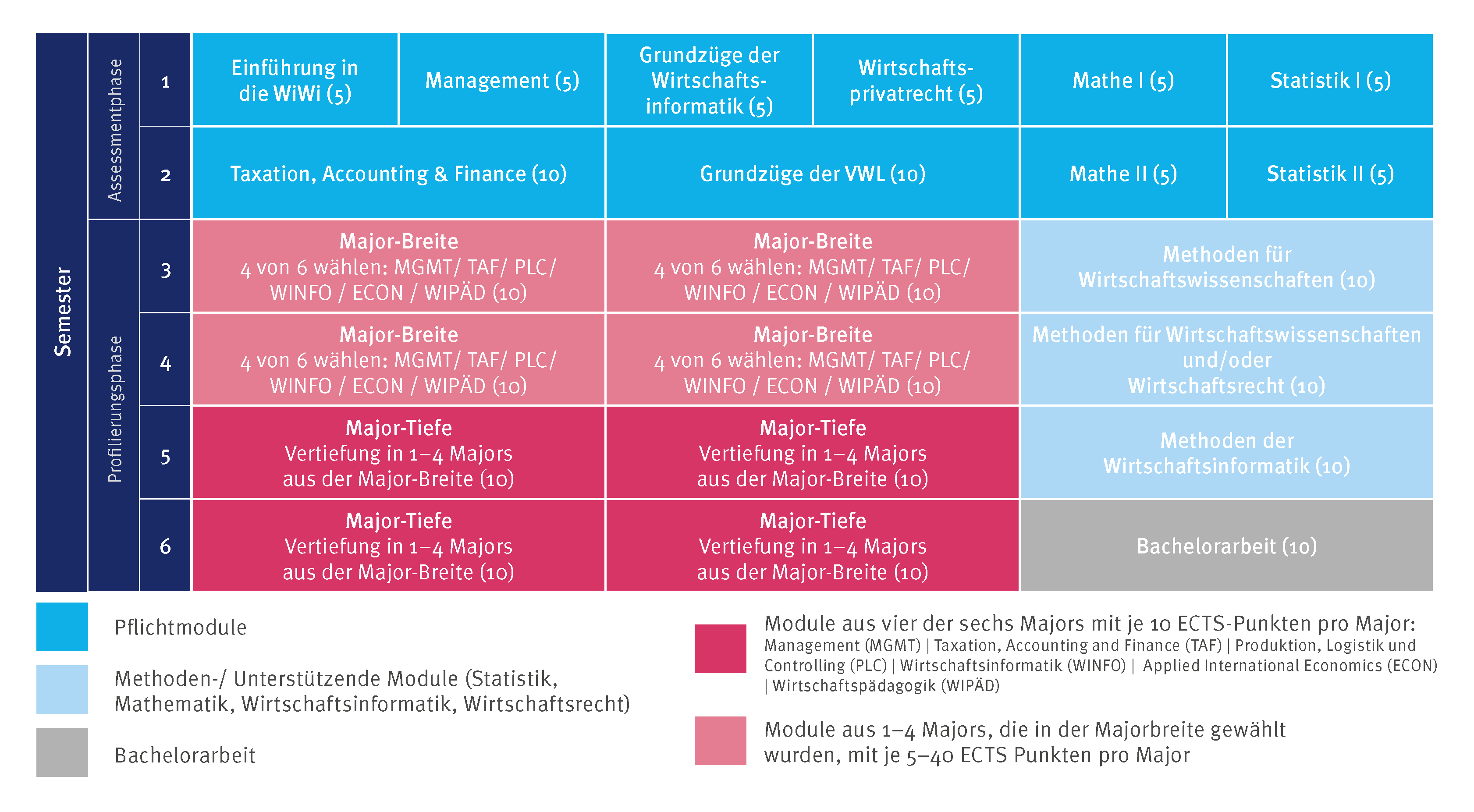 Ab dem dritten Semester gestaltest du dann dein Studium nach deinen Vorstellungen! Nutze den Freiraum in der Profilierungsphase, um dein persönliches Profil zu entwickeln. Wähle aus sechs Schwerpunkten (siehe unten) - sogenannte Majors - deine Lieblingsthemen, geh für ein Semester ins Ausland oder nimm am Exzellenzprogramm teil. Zahlreiche Möglichkeiten stehen dir offen.