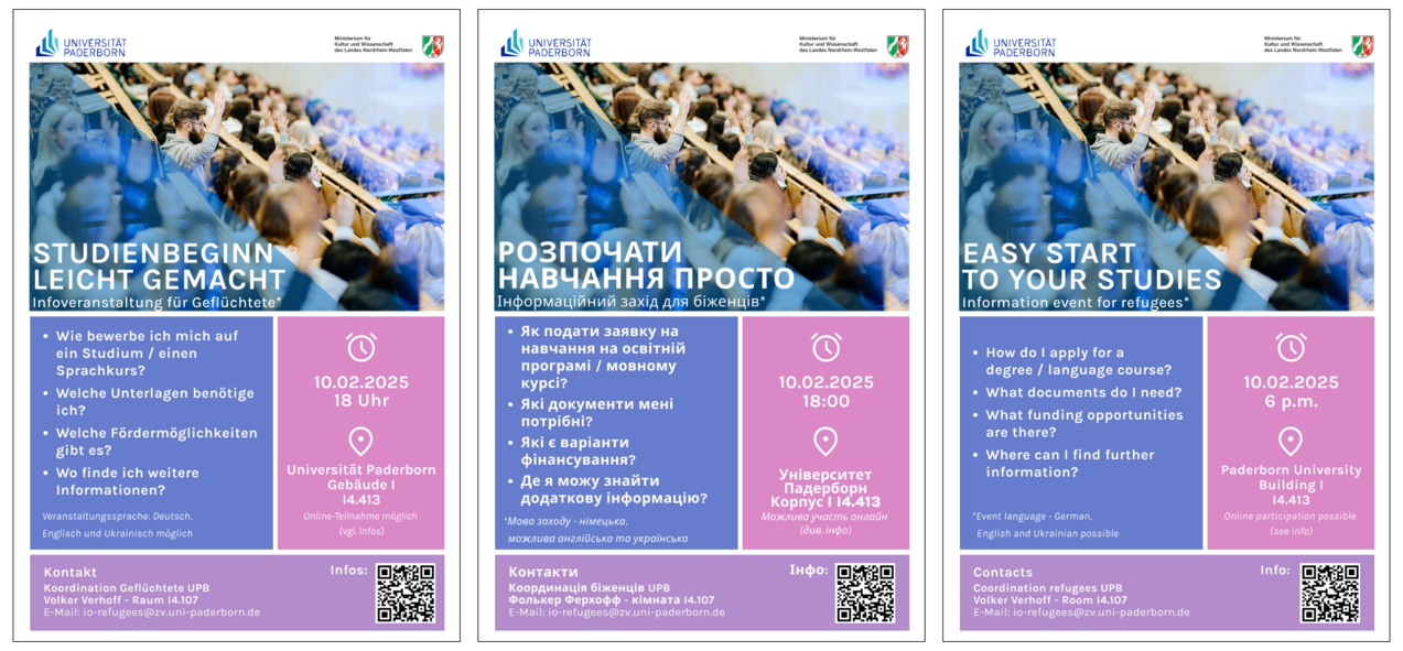 Am 15. August 2024 bieten wir um 18 Uhr in Raum I4.413 eine Veranstaltung für studieninteressierte Geflüchtete an. Wir informieren über den Bewerbungs- und Zulassungsprozess an der Universität Paderborn. Es wird darum gehen, welche Unterlagen dafür benötigt werden und welche Möglichkeiten es gibt, wenn Dokumente nicht vorliegen. Außerdem informieren wir über Fördermöglichkeiten und stehen für Fragen zur Verfügung.