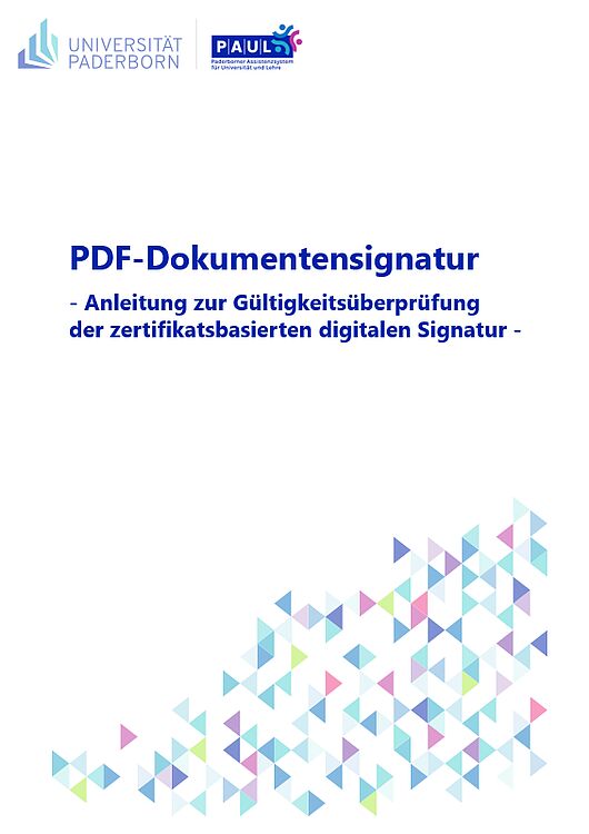 Seit dem Wintersemester 2017/2018 werden ausgewählte PDF-Dokumente, wie bspw. die "Immatrikulationsbescheinigung" und der "Notenspiegel Online", mit einer zertifikatsbasierten Signatur digital unterschrieben. Dabei handelt es sich um ein für die Universität Paderborn ausgestelltes Zertifikat, dessen Vertrauenswürdigkeit im Auslieferungszustand des Adobe Acrobat Reader bzw. Adobe Acrobat Professional nicht überprüft werden kann.