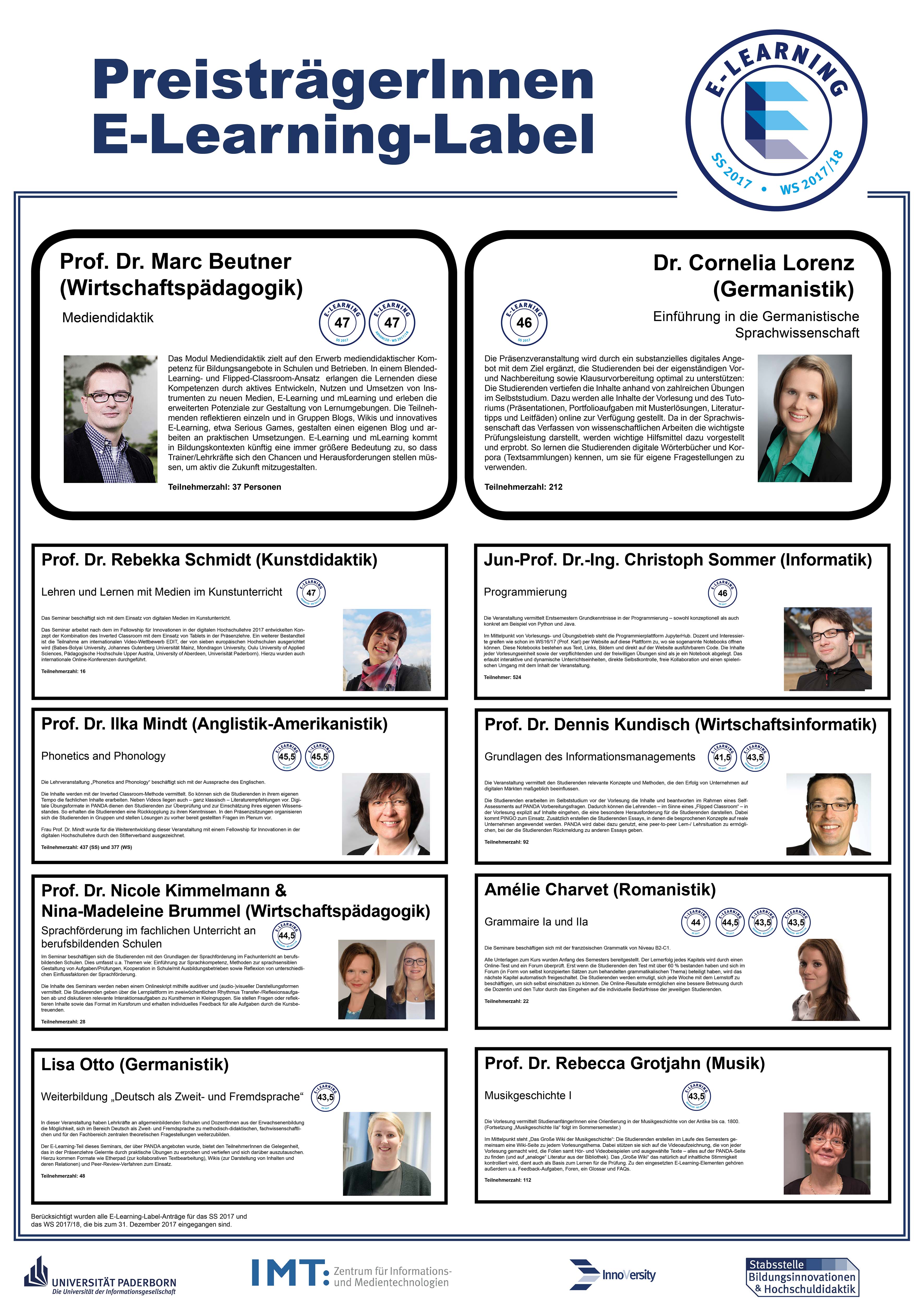 Die Preisträger*innen 2017 (SoSe 2017 + WiSe 2017/2018) des E-Learning-Labels der Universität Paderborn, vergeben am Tag der Lehre 2018.