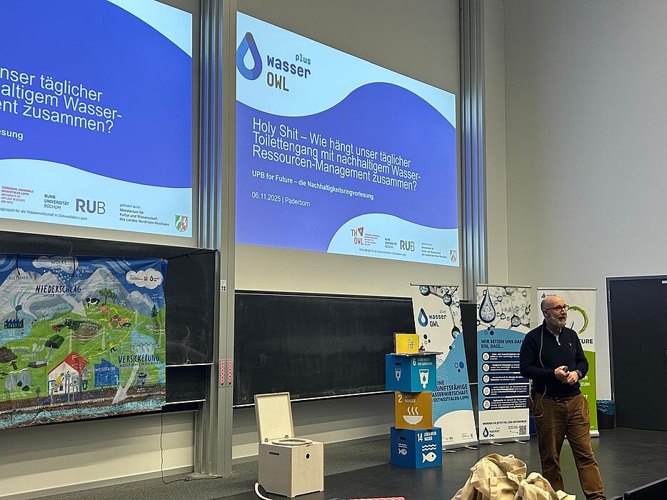 Als Leiter des Fachgebiets Siedlungswasserwirtschaft im Fachbereich Bauingenieurwesen an der Technischen Hochschule Ostwestfalen-Lippe (TH OWL) in Detmold und Vertreter des Netzwerks wasser^plus OWL war Prof. Dr. Jörg Felmeden am 06.11.2025 zu Gast in der Ringvorlesung “UPB for Future”. In seinem Vortrag stellte er die im Hinblick auf den Klimawandel immer komplexer werdenden Herausforderungen in der Wasserwirtschaft dar und erläuterte wie Städte und Infrastrukturen durch inter- und transdisziplinäre Lösungsansätze „klimafit“ gestaltet werden können. Im Fokus standen dabei Ressourcenorientierte Sanitärsysteme (NASS), die durch weitgehende Schließung von Stoff- und Wasserkreisläufen einen wichtigen Beitrag zum nachhaltigen Umgang mit Wasser und Abwasser leisten können.