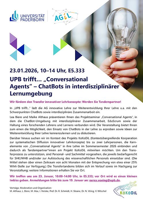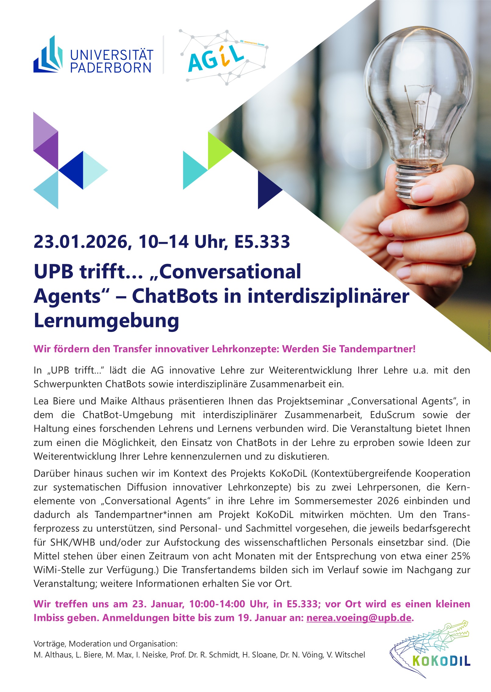 Zudem sucht das Projekt KoKoDiL (Kontextübergreifende Kooperation zur systematischen Diffusion innovativer Lehrkonzepte) bis zu zwei Lehrpersonen, die ab dem Sommersemester 2026 Kernelemente des Projekts „Conversational Agents“ in ihre Lehre integrieren und als Tandempartner*innen mitwirken möchten. Für den Transfer stehen Personal- und Sachmittel zur Verfügung.
