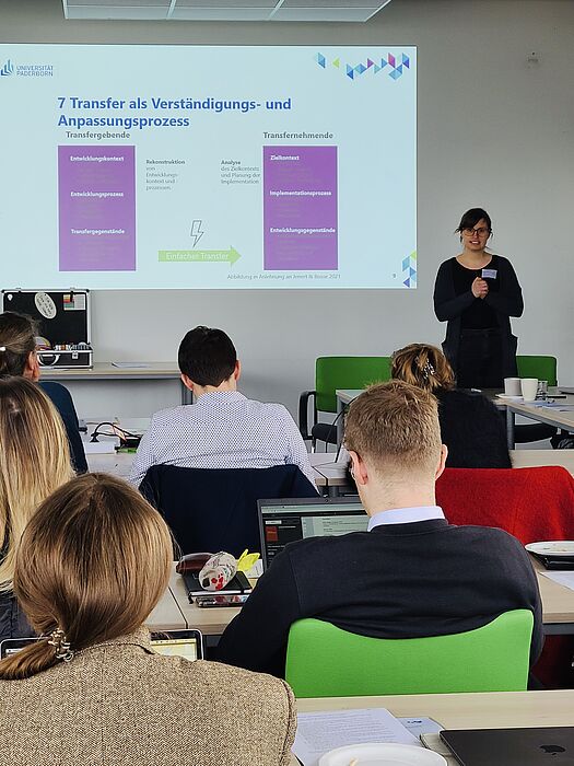 Im Anschluss widmete sich der zweite Teil der Veranstaltung den Transfergegenständen des innovativen Lehrkonzepts von Maike Althaus und Lea Biere. Neben der Entwicklung des ChatBots gehören dazu die Haltung des Forschenden Lernens und Lehrens, Interdisziplinarität sowie die Methode EduScrum: