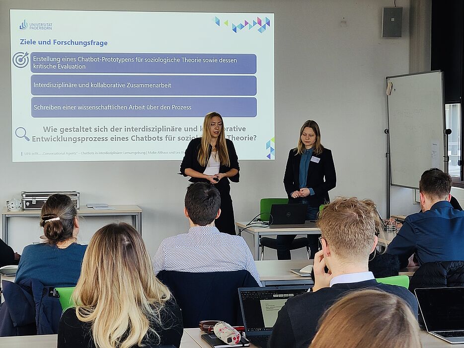 Im ersten Teil der Veranstaltung stellten Maike Althaus und Lea Biere ihr Projektseminar „Conversational Agents: Wirtschaftsinformatik und Soziologie im Dialog“ vor, das sich der Entwicklung eines ChatBot-Prototypen für die sozilogische Theorie gewidmet hat und dabei mit der interdisziplinärer Ausrichtung Studierende der Fachbereiche Wirtschaftsinformatik und Soziologie zusammengebracht hat.