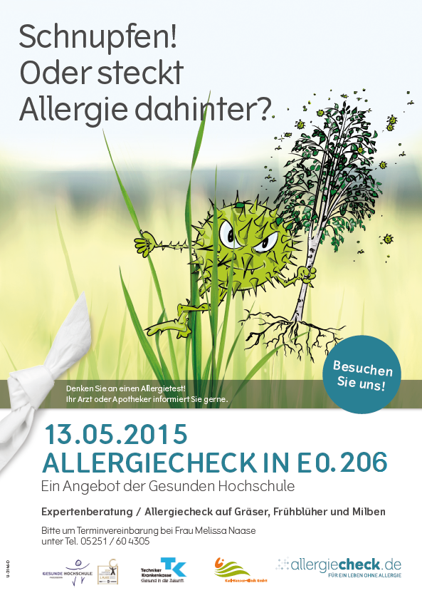 Falls Sie den Verdacht haben, auch unter einer Allergie zu leiden, haben Sie die Möglichkeit am 13.05.2015 zwischen 8 und 17 Uhr nach Terminvereinbarung unter 60-4305 an einem Allergie-Schnelltest auf Gräser, Frühblüher und Milben in E0.206 teilzunehmen.