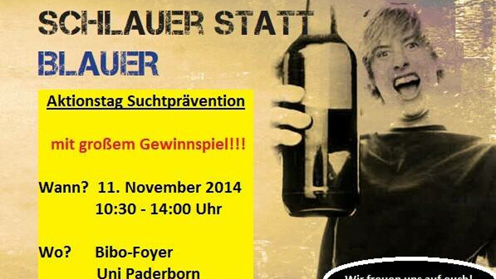 Aktionsstände im Rahmen des Peer-Projektes der Universität Paderborn: Die studentischen Gruppen möchten in diesem Jahr über Cannabis und Ritalin und deren Folgen informieren. Die Aufklärung geschieht in Verbindung mit einem kleinen Quiz am Glücksrad. Unter allen Teilnehmern werden mehrere tolle Preise verlost, wie z.B. Gutscheine vom Hochschulsport. Außerdem erhält jeder Teilnehmer einen Sofortgewinn.