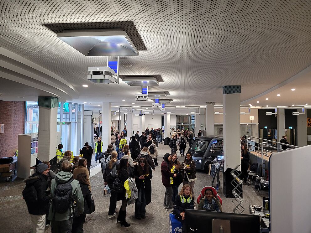 Zahlreiche neon-gelbe Warnwesten inmitten eines bunten Treibens im Bibliotheks-Foyer und vor dem Haupteingang der Universität Paderborn waren ein deutliches Zeichen: Einen Tag lang stand an der der Uni Paderborn alles im Zeichen der Sichtbarkeit und Sicherheit im Straßenverkehr.