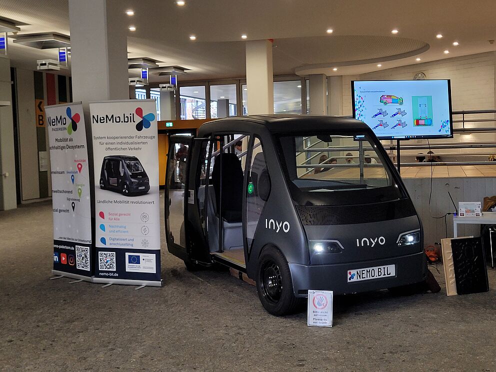 Ein besonderes Highlight war das NeMo.bil-Cab, ein Prototyp aus der Initiative „Neue Mobilität Paderborn“ (NeMo) rund um Initiator Prof. Dr. Thomas Tröster. Ziel des Projekts ist es, ein innovatives Mobilitätssystem für den bedarfsgerechten Personen- und Gütertransport zu entwickeln und prototypisch aufzubauen.