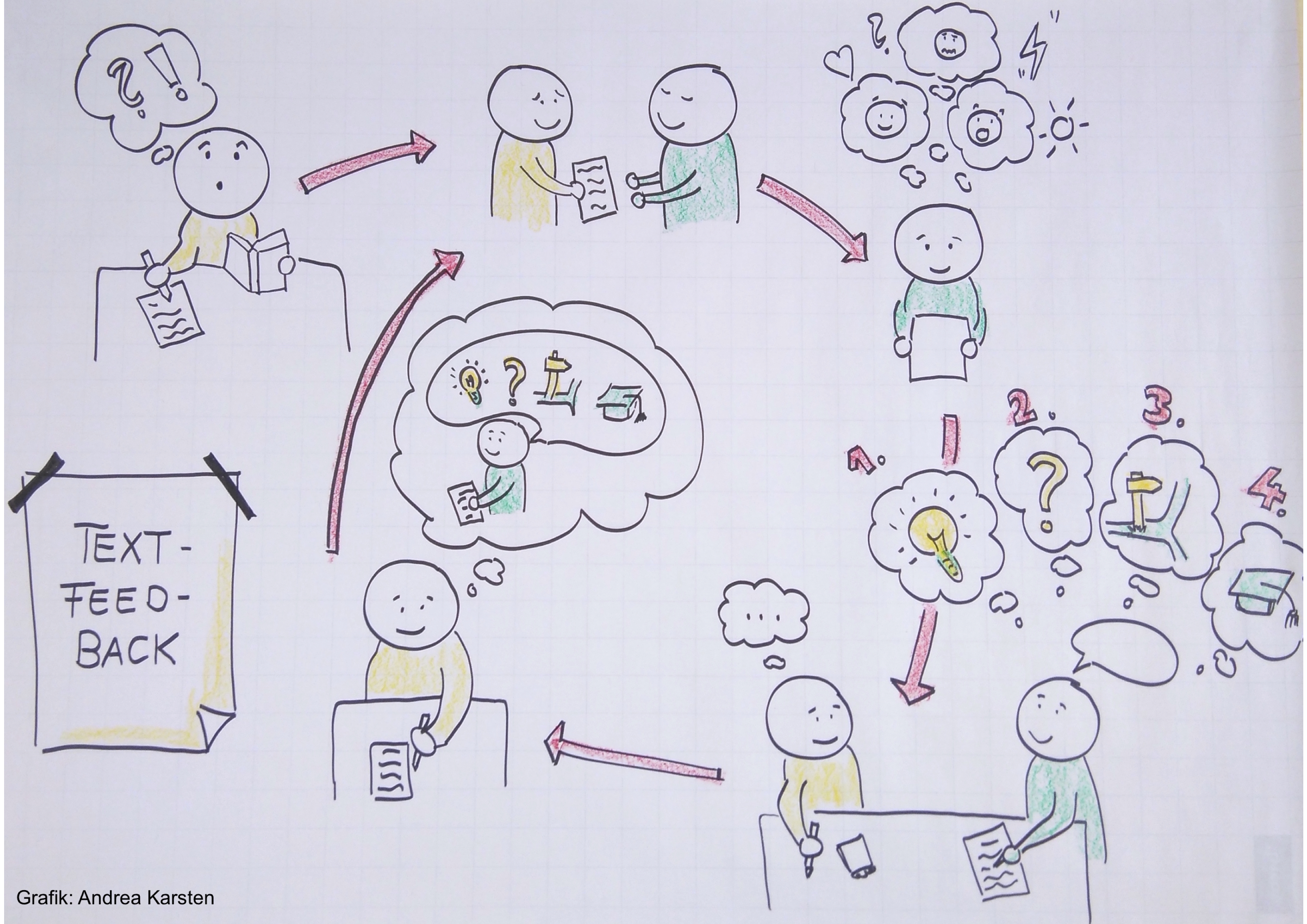 Im letzten Schritt entscheidet die Person, die den Text geschrieben hat, wie sie ihren Text überarbeiten möchte. Dabei hat sie die Feedback-Situation verinnerlicht und lernt so Schritt für Schritt, Leser*innen und ihre Reaktionen beim Schreiben und Überarbeiten zu antizipieren.