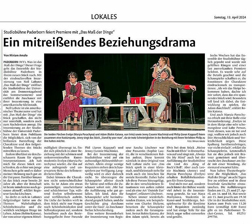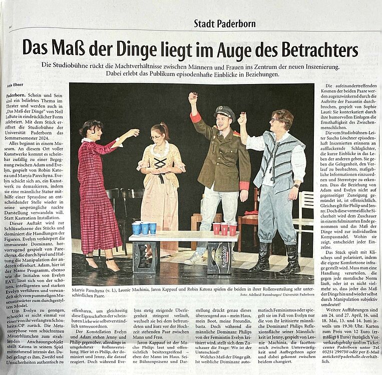 Mit „das maß der dinge“ hat der US-amerikanische Erfolgs-Autor Neil LaBute eine hintersinnige Satire über Wahrhaftigkeit und Schönheitswahn, Kunstanspruch und die wirklich wichtigen Dinge im Leben geschrieben.