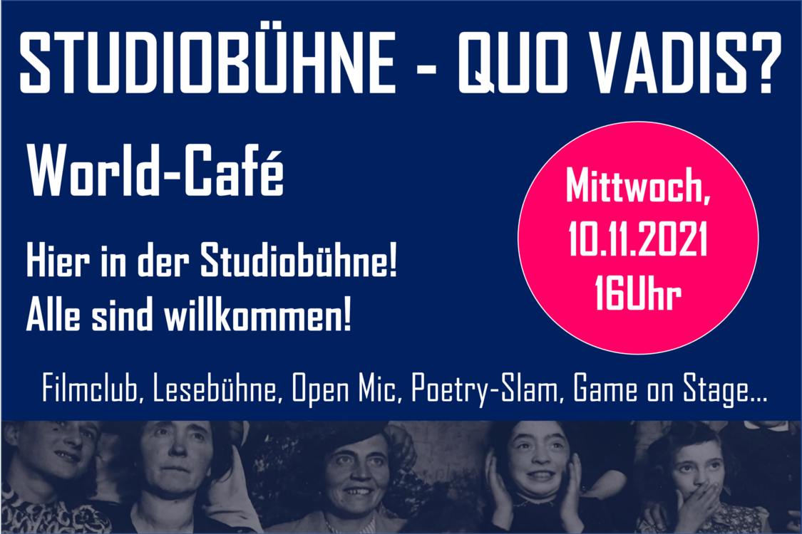 Was soll oder kann dort alles stattfinden? Theater, Film, Diskussion, Performance? Was sollte diese Bühne leisten? Wer möchte sich einbringen? Was ist möglich, wünschenswert, längst fällig? Im Rahmen eines World-Cafés möchten wir Ideen und Engagierte kennenlernen und vernetzen. Und wer weiß, vielleicht hast Du ja bald Deine eigene Veranstaltungsreihe in der Studiobühne am Start?