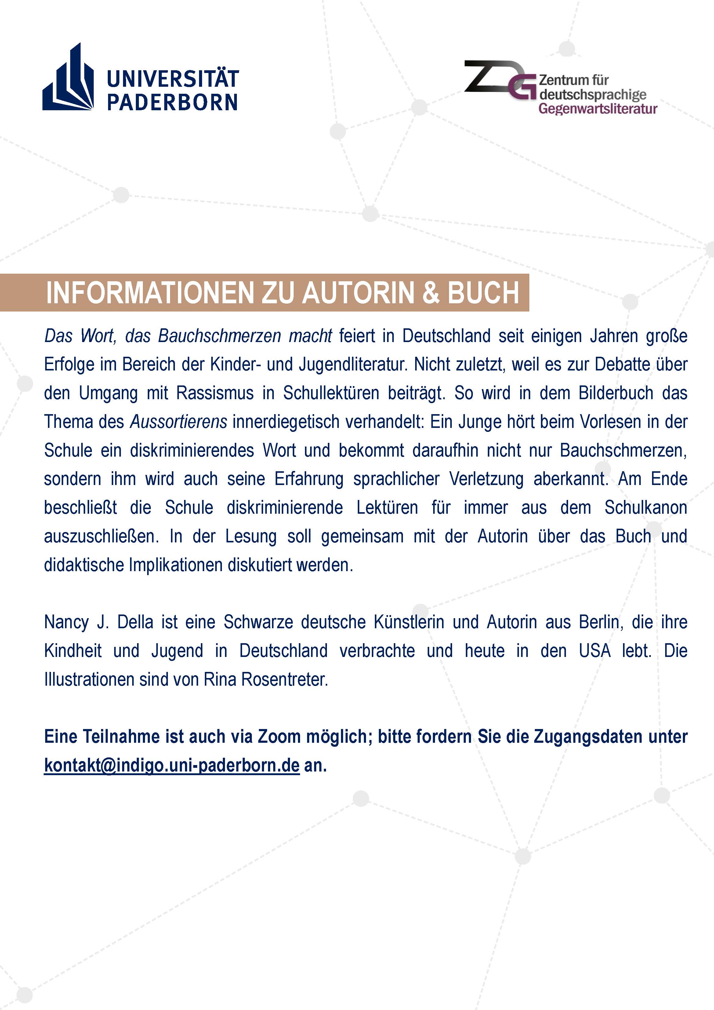 Jun.-Prof. Dr. Magdalena Kißling und Dr. Johanna Tönsing vom Institut für Germanistik und Vergleichende Literaturwissenschaft der Universität Paderborn veranstalten im Rahmen der Tagung „Einfach Aussortieren? Machtaffirmierende Erzählwelten zwischen Zumutbarkeit und Verletzung in der literaturdidaktischen Diskussion“ eine Autorinnenlesung. „Das Wort, das Bauchschmerzen macht“ feiert in Deutschland seit einigen Jahren große Erfolge im Bereich der Kinder und Jugendliteratur. Nicht zuletzt, weil es zur Debatte über den Umgang mit Rassismus in Schullektüren beiträgt. In der Lesung soll gemeinsam mit der Autorin Nancy J Della über das Buch und didaktische Implikationen diskutiert werden. Della ist eine Schwarze deutsche Künstlerin und Autorin aus Berlin, die ihre Kindheit und Jugend in Deutschland verbrachte und heute in den USA lebt. Die Illustrationen sind von Rina Rosentreter. Eingeladen sind alle Interessierten, sie können sowohl vor Ort in der Studiobühne als auch online per Zoom teilnehmen. Den Zoom-Link erhalten die Teilnehmenden auf Anfrage per E-Mail an: kontakt(at)indigo.uni-paderborn(dot)de.