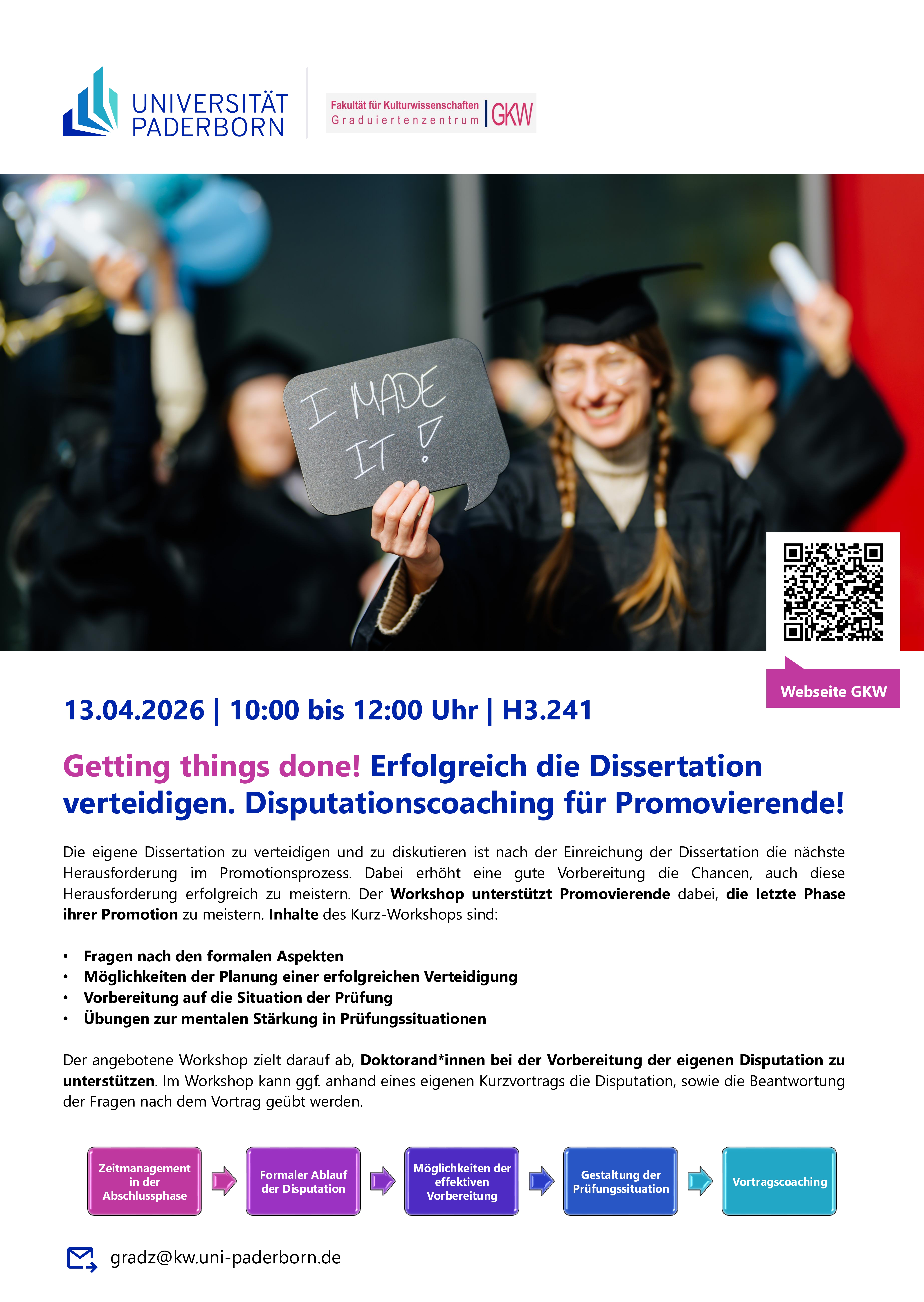 Die eigene Dissertation zu verteidigen und zu diskutieren ist nach der Einreichung der Dissertation die nächste Herausforderung im Promotionsprozess. Eine gute Vorbereitung erhöht die Chancen, auch diese Herausforderung erfolgreich zu bewältigen. Um Promovierende dabei zu unterstützen, die letzte Phase ihrer Promotion zu meistern, bietet das Graduiertenzentrum der Fakultät für Kulturwissenschaften (GKW) an der Universität Paderborn am Montag, 13. April, den Workshop „Getting things done! Erfolgreich die Dissertation verteidigen“ an. Er findet von 10 bis 12 Uhr in Raum H3.241 statt. Interessierte können sich per E-Mail an gradz@kw.uni-paderborn.de anmelden.