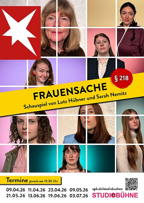 Im Sommersemester 2026 führt die Studiobühne der Universität Paderborn das Stück „FRAUENSACHE“ der Autor*innen Lutz Hübner und Sarah Nehmitz auf. Mit einem Ensemble von sechs Frauen thematisiert das Stück verschiedene gesellschaftliche Diskurse und verbindet diese miteinander, darunter die Debatte um Schwangerschaftsabbrüche, die Flüchtlings- und Zuwanderungsthematik sowie die Strategien rechter politischer Bewegungen. So kommt es im Zentrum von „FRAUENSACHE“ zu einer Bürgerversammlung, bei der die unterschiedlichen Positionen zu den Thematiken aufeinanderprallen.