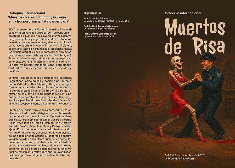 Am 3. und 4. Dezember findet an der Universität Paderborn eine internationale Tagung zum Thema „Muertos de risa. El humor y la ironía en la ficción criminal latinoamericana" statt. Bei der Veranstaltung wird untersucht, wie lateinamerikanische Autor*innen, Filmemacher*innen und Comickünstler*innen Humor nutzen, um kritische Themen anzusprechen, Tabus zu brechen und gesellschaftlichen Wandel anzustoßen. Die Tagung findet in den Räumen I 1.404 und B 3.231 statt. Eine Anmeldung ist per Mail an resul.karaca@uni-paderborn.de möglich, alle Vorträge finden auf Spanisch statt.