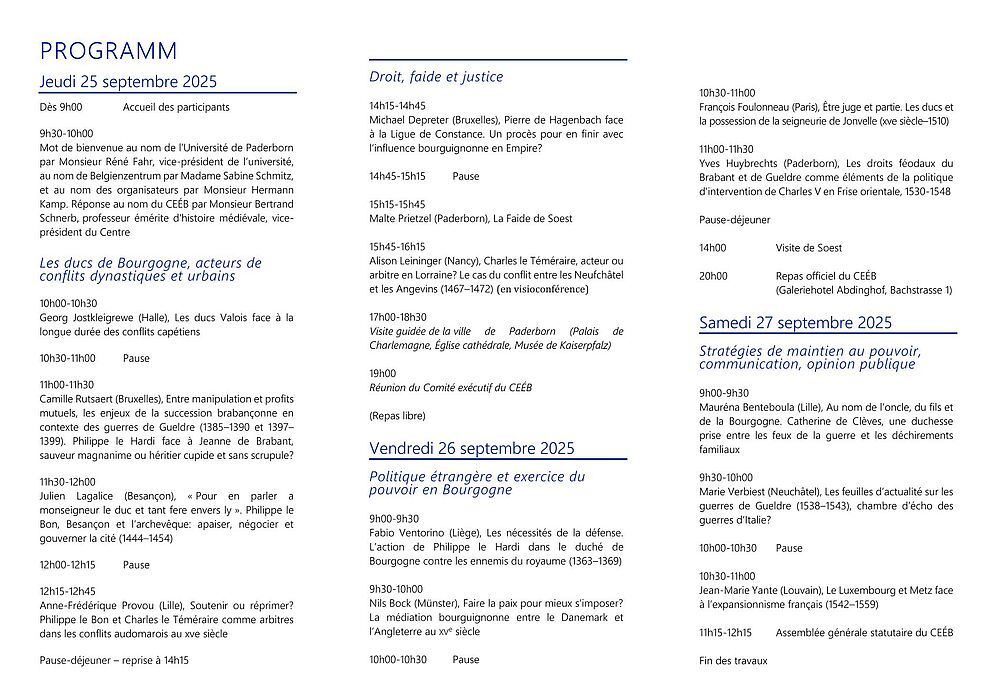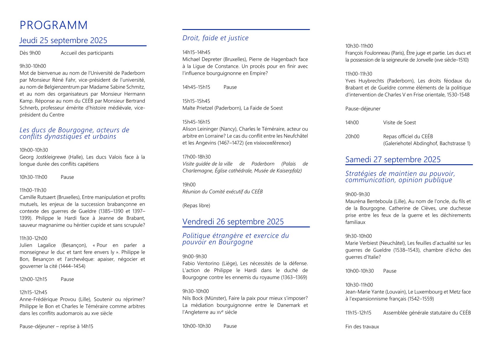 Vom 25. bis zum 27. September veranstaltet das „Centre Europeén d’Études bourguignonnes“ seine Jahrestagung an der Universität Paderborn. Das Centre ist eine europäische Vereinigung von Wissenschaftler*innen, die sich mit der Geschichte des spätmittelalterlichen Burgunds beschäftigen. Thema der Tagung ist das Vorgehen der Herzöge von Burgund in den Konflikten ihrer Zeit, bei der es insbesondere um die Frage geht, ob und wie die Herzöge Auseinandersetzungen in benachbarten Territorien nutzten, um ihren Einfluss auszuweiten. Die von der Universität Paderborn, dem Institut zur interdisziplinären Erforschung des Mittelalters und seines Nachwirkens (IEMAN) und dem Belgienzentrum (BELZ) unterstützte Veranstaltung beginnt am Donnerstagmorgen um 9.30 Uhr. Die Tagung findet im Raum Q0.101 statt, die Konferenzsprache ist Französisch. Zu den Vorträgen sind alle Interessierten herzlich eingeladen.