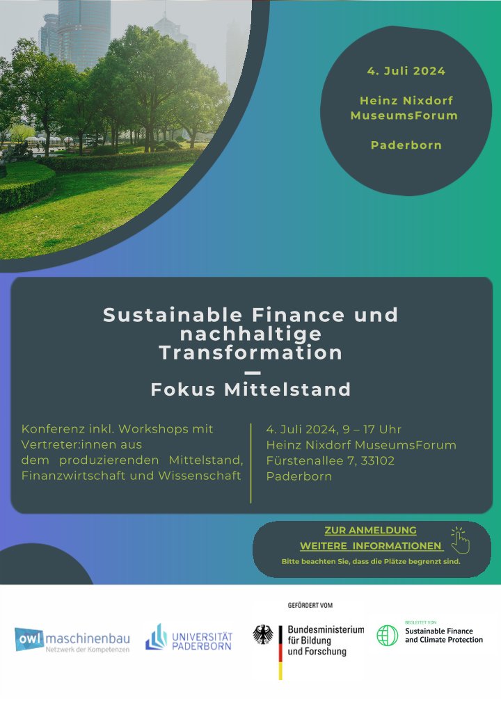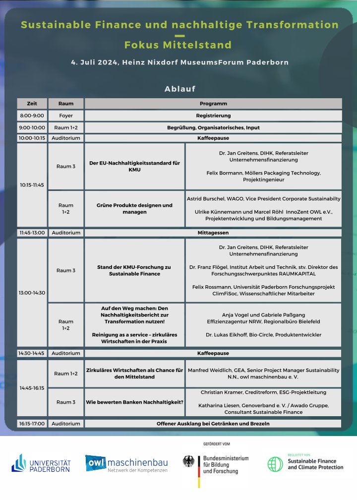 Die Tagung wird von der Förderlinie „Klimaschutz und Finanzwirtschaft“ (KlimFi) des Bundesministeriums für Bildung und Forschung (BMBF) über das Forschungsprojekt „Climate Finance Society“ (ClimFiSoc) der Universität Paderborn gefördert und gemeinsam mit „owl maschinenbau e.V.“ organisiert. Weitere Informationen zum Programm und die Möglichkeit zur Anmeldung gibt es auf der Veranstaltungsseite. Die Zahl der Teilnahmeplätze ist begrenzt.