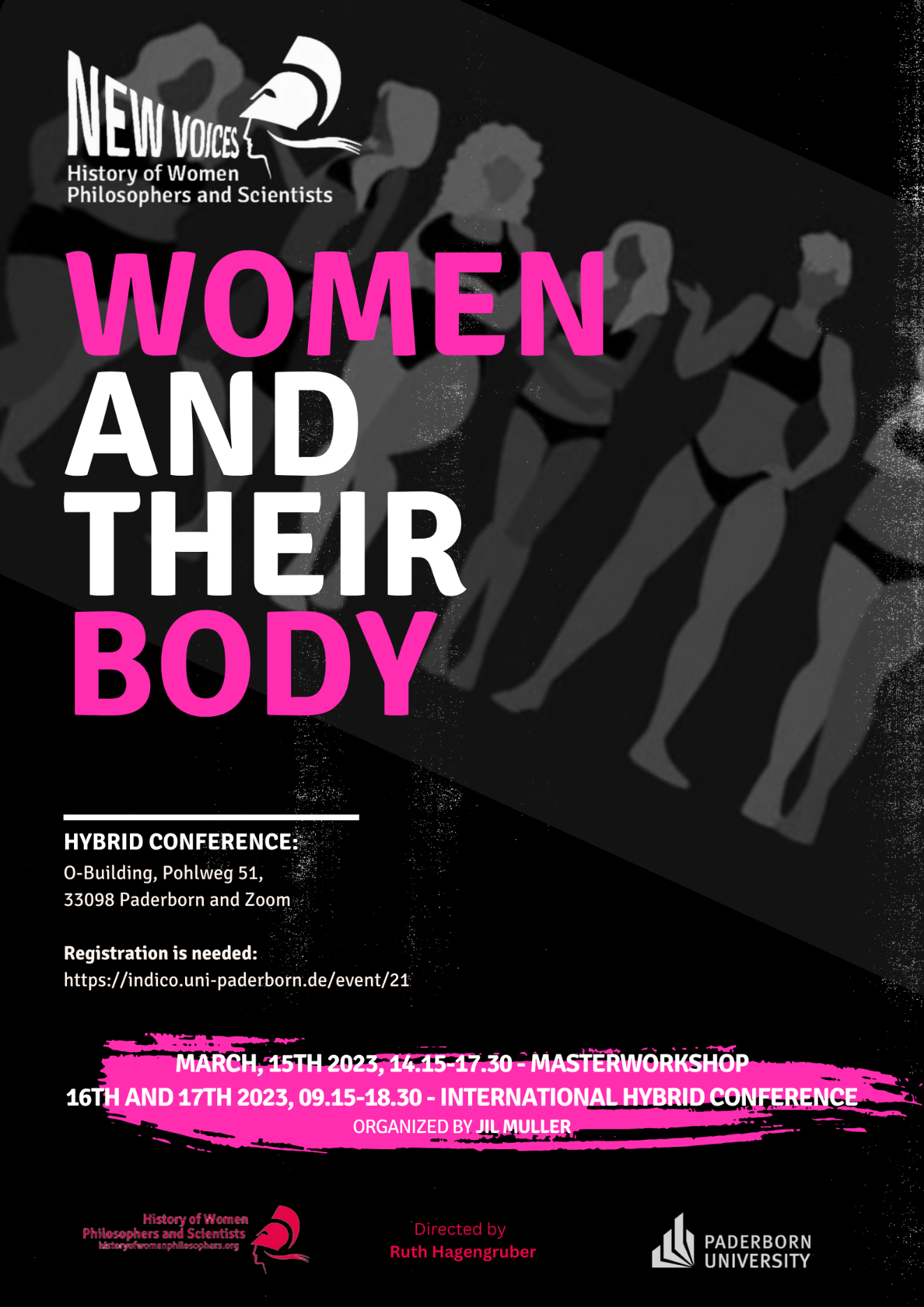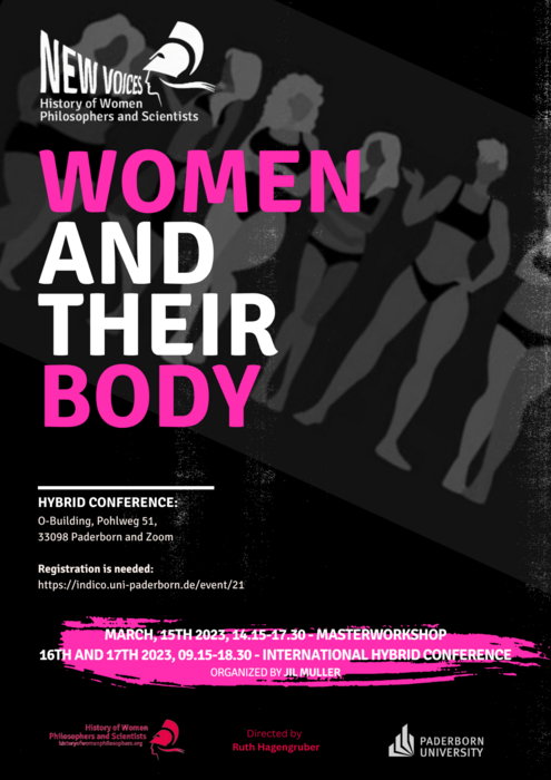 Von Mittwoch, 15., März bis Freitag,17. März findet an der Universität Paderborn die von Dr. Jil Muller organisierte internationale, hybride Konferenz am Center for the History of Women Philosophers and Scientists statt. Gemeinsam beziehen die Geistes- und Kulturwissenschaften Stellung zu dem brisanten Thema „Frauenrecht auf den eigenen Körper". Aktuelle und auch vergangene Ereignisse in zahlreichen Ländern verlangen nach einer Stellungnahme, die von vielen Wissenschaftler*innen aus unterschiedlichen Forschungsbereichen formuliert wird. Alle Interessierten sind eingeladen teilzunehmen. Die Konferenz kann sowohl in Präsenz als auch online per Zoom besucht werden. Das vollständige Programm sowie die Möglichkeit zur Anmeldung sind online zu finden.
