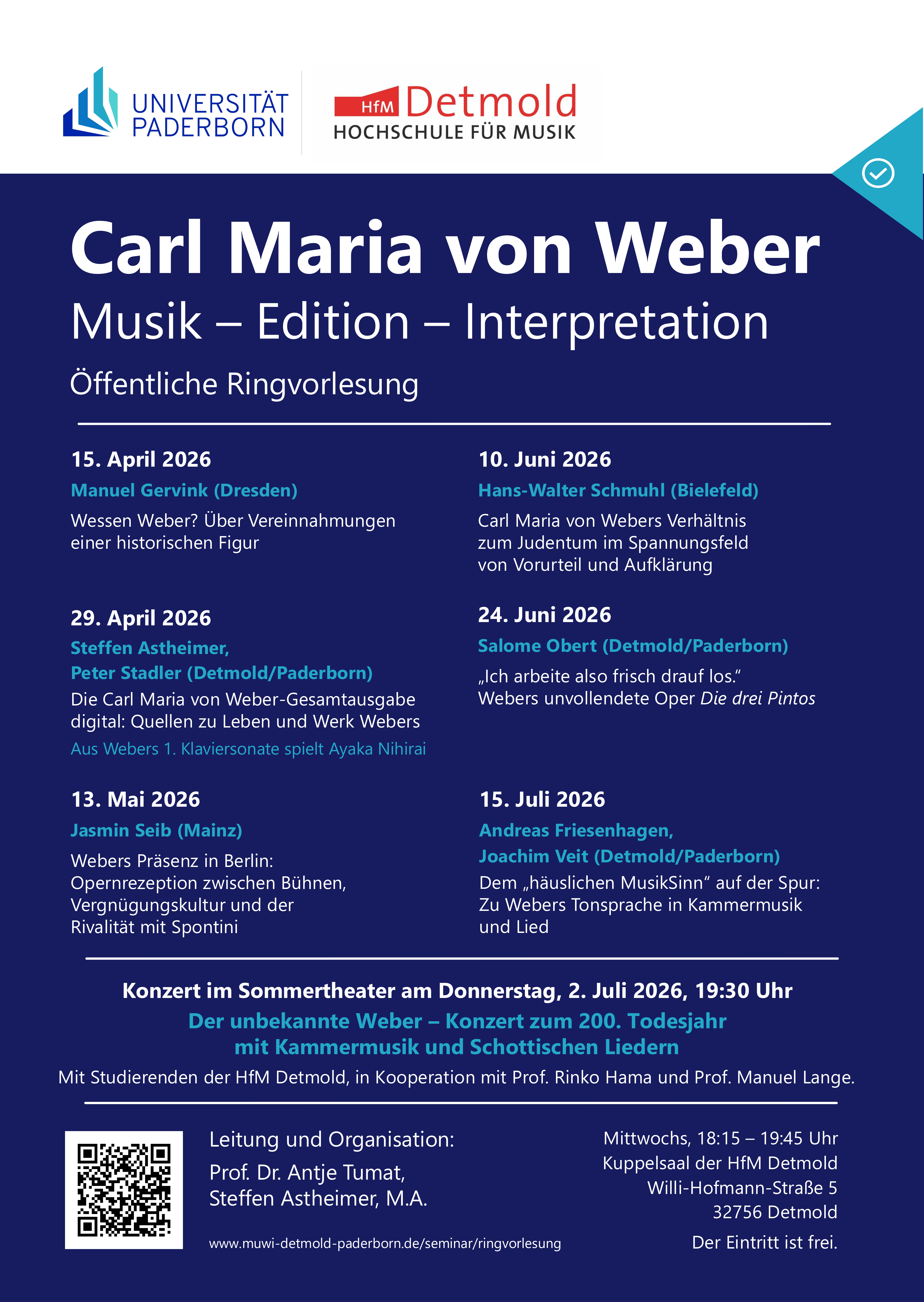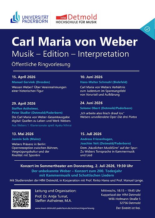 Begleitend zur Ringvorlesung findet am Donnerstag, 2. Juli, ab 19.30 Uhr im Detmolder Sommertheater das Konzert „Der unbekannte Weber – Konzert zum 200. Todesjahr mit Kammermusik und Schottischen Liedern“ statt. Dieses wird von Studierenden der HfM Detmold unter der Leitung von Prof. Rinko Hama und Prof. Manuel Lange gespielt. Auch hier ist der Eintritt kostenlos.