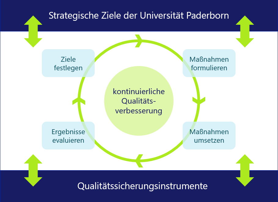 Das Qualitätsmanagementkonzept der Universität Paderborn wurde 2008 verabschiedet und seitdem stetig weiterentwickelt. Zur Umsetzung des Qualitätsmanagementsystems (QMS) hat die Universität Paderborn Ziele definiert, die sie in einem kontinuierlichen Verfahren (Qualitätsregelkreis) überprüft. Ein fortlaufendes Berichtswesen, der Abschluss von Zielvereinbarungen und dazugehörigen Maßnahmen sowie regelmäßige Reflexion sorgen für eine nachhaltige Qualitätssicherung.